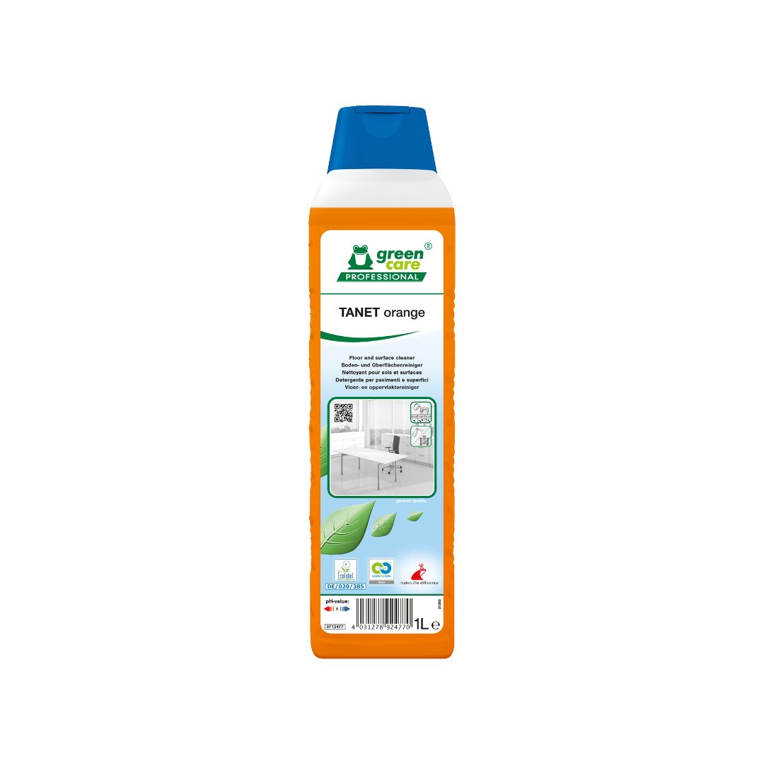 TANET orange è un detergente di manutenzione per pavimenti e superfici con eccellenti proprietà ambientali e una gradevole profumazione all’arancia. Viene prodotto rispettando i cicli biologici, la salute delle persone e la sicurezza degli operatori